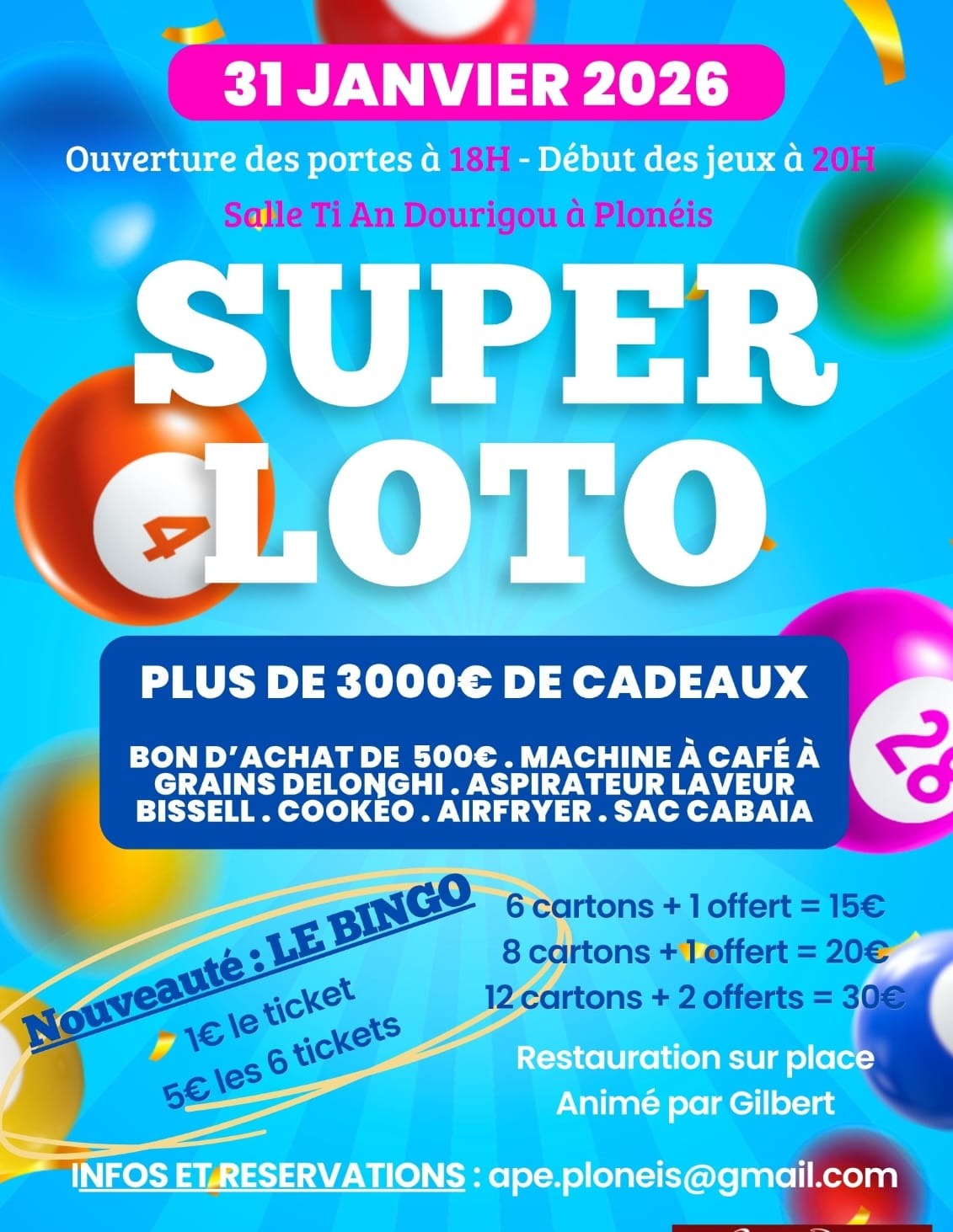 Venez tenter votre chance mais pensez à réserver vos places sur : ape.ploneis@gmail.com car ce loto attire déjà de nombreux joueurs du Finistère Sud.
